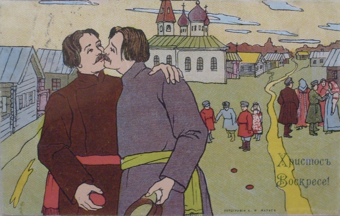 Традиционные атрибуты российской дореволюционной открытки – пасхальные яйца, куличи, храмы, цветы, взрослые и дети, поздравляющие друг друга с праздником, цветущие ветви вербы.