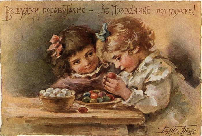Особенное место среди дореволюционных пасхальных открыток занимают открытки, созданные художницей Елизаветой Бём, ученицей выдающегося русского художника Ивана Крамского. Главные действующие лица её открыток – дети. На открытках этой художницы часто есть присказка, поучительная или поздравительная надпись.