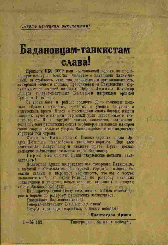 Из подвижных войск необходимо особо отметить 24-й танковый корпус генерал-майора В. М. Баданова, ставшего у нас первым кавалером ордена Суворова II степени. Оторвавшись от своих войск, этот корпус 24 декабря неожиданно атаковал и захватил станцию Тацинская с огромным количеством трофеев.