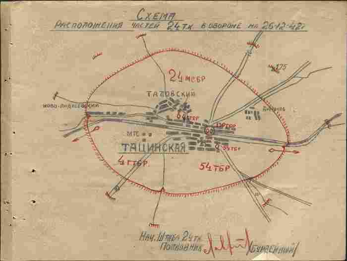 В 23.00 24.12.42 получено боевое распоряжение штакора 24Т с задачей 54ТБр занять оборону по восточной, юго-восточной и юж.окр. ст. Тацинская. Боевое охранение иметь по железной дороге 5 км. вост. Тацинская, по дороге ведущей на свх№36, что 1 км ю-в развилки дорог, по дороге идущей на Ниж.Кольцов, что 4 км ю-в Тацинская. Разведку вести на Сенной, Крылов, ..., Верхний Кольцов.