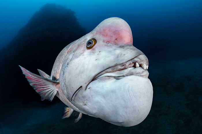 Зовут это диво-дивное азиатским овцеголовым губаном (Semicossyphus reticulatus). Он, или она (тут есть одна неясность), поэтому скажем "они", водятся в Тихом океане у берегов Кореи и Японии, и называются на японском "кобудай".