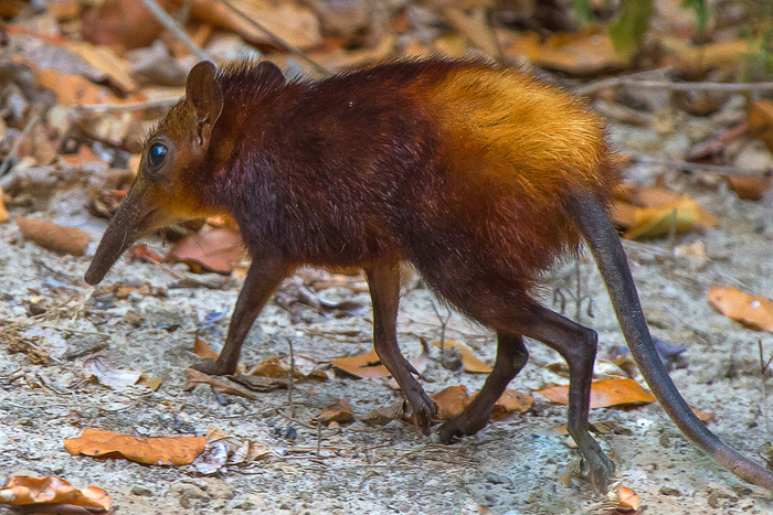 Это сравнительно небольшое существо, которое достигает длины около полуметра от кончика длинного носа, до кончика не менее длинного хвоста, который составляет почти половину всей длины.