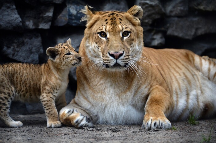 Естественно, самыми крупными гибридами являются гибриды тигра и льва. Но примечательно, что тигрольвы (у которых отец тигр) меньше лигров (у которых отец лев). Это связано с интересным явлением, которое называется геномным импринтингом. Хромосомы отвечающие за рост особи находятся у отца, а хромосомы сдерживающие рост – у матери. Считается, что у моногамных видов гены слабее. Поэтому, когда скрещивают моногамного тигра с полигамной львицей, гены отвечающие за рост у отца слабее материнских, сдерживающие рост.
