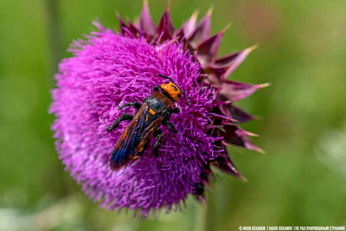 В-третьих, в отличие от ос, производящих гнёзда, этой осе нечего защищать. Какой смысл вступать с вами в единоборство и рисковать, если драться ей не за что. Она просто перелетит на соседний цветок, или выберет себе другой "начинённый" пень неподалёку 😊