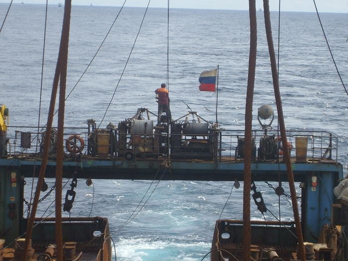 Но никакая погода и качка не мешают настоящим бруталам проверять оборудование. На фото мастер лова погнал на кормовой портал что-то проверять на маленькой лебёдке прибора, который опускается вместе с тралом и показывает на ходовом мостике на экранах скопление рыбы. Насколько помню назывался ИГЭК - измеритель глубины эхолотный кабельный.