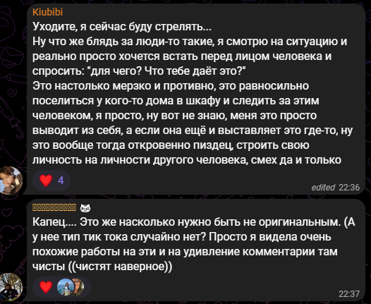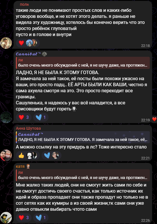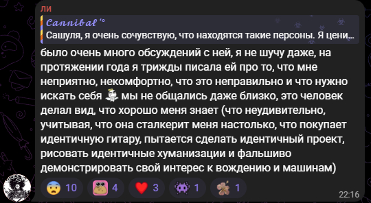UPD для Лиги Лени: Одна духовно богатая и ментально уязвимая художница устроила в своем ТГ-канале на 3000 человек травлю одной из своей поклонниц, когда ей показалось, что та вдохновляется ее работами слишком активно, а еще купила себе такую же гитару с Хелло-Китти и даже учится водить машину, прям как ее кумир. В процессе выяснилось, что поклоннице 12 лет, а всем участвующим в травле - 20+, в том числе и самой художнице, но это сделало все еще хуже. Еще в процессе выяснилось, что люди, исповедующие СЖВ-повестку и требующие уважать свои чувства - сами ничьи чувства не уважают, не имеют никаких особых угрызений совести и готовы размотать любого, кто им не нравится.