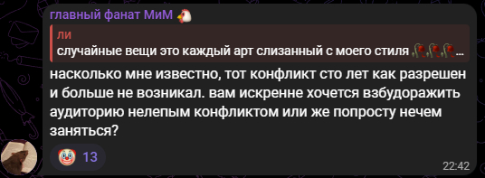 Который тем временем собрал уже почти 400 негодующих комментов (вместо 20-30 под "творческими" постами) - очевидно соевичкам движуха понравилась и эмоции возмездия во имя луны вызывает приятные. И нет, это не школьники на форуме по ДОКЕ2 и не пенсионеры в политических постах ВК - это совершеннолетние кобылы обсуждают творчество 12-летней девочки, которая с ними в одной фан-группе состоит: