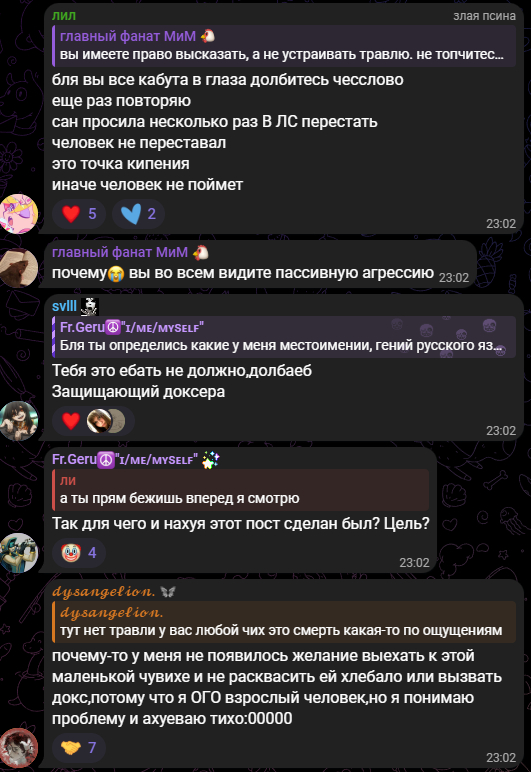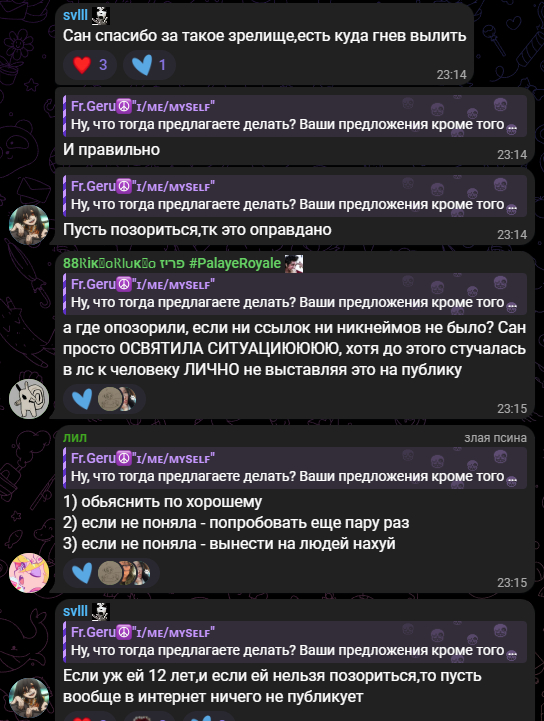 В общем, эффект произошел ровно такой, как и ожидалось - милые девочки с нарисованными бровями, которые всех любят и вообще за мир во всем мире, нарушительницу безарбузного сейфспейса сразу же вычислили, благо она тут же в чатике сидит, и начали наваливать ей экскрементов на лопате по всем доступным каналам. Навалились на тот самый канал со 100 подписчиков, посетители которого несколько охренели от толпы матерящихся школьников (можно же в 20 лет быть школьником?), начинающих свои комменты со слов вроде "хватит вылизывать ей очко, вы ничо не понимаете!". Кто-то даже попросил вести себя чуть более вменяемо, а то как-то заявлять незнакомому человеку, что он очко кому-то вылизывает, при этом светя во все стороны своей рожей, может быть чревато - мало ли он не школьник вовсе, в соседнем доме живет и сходит к тебе спросить, что это за перформанс. А тебе уже 21 год и ты за мир во всем мире (кроме тех, кто тебе не нравится), но по роже ни разу в жизни не получала.