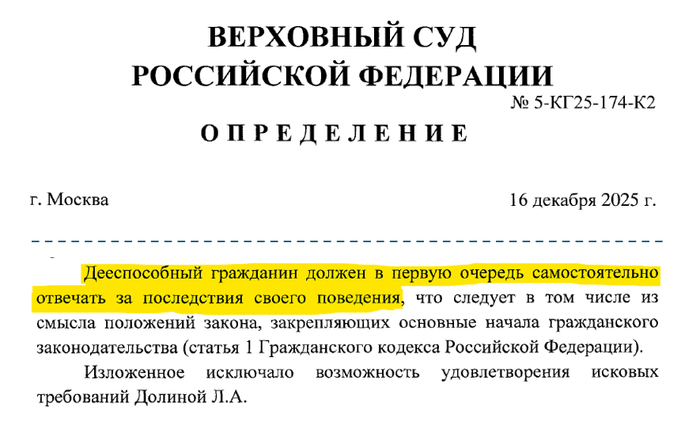 🐌 Верховный Суд отдельно указал на то, что дееспособный гражданин должен сам отвечать за последствия своего поведения (см. прикрепленный скрин). Ситуация, когда бабуля сама приняла решение отдать все свои деньги мошенникам, а все убытки от этого решения возлагают на добросовестного приобретателя – является недопустимой.