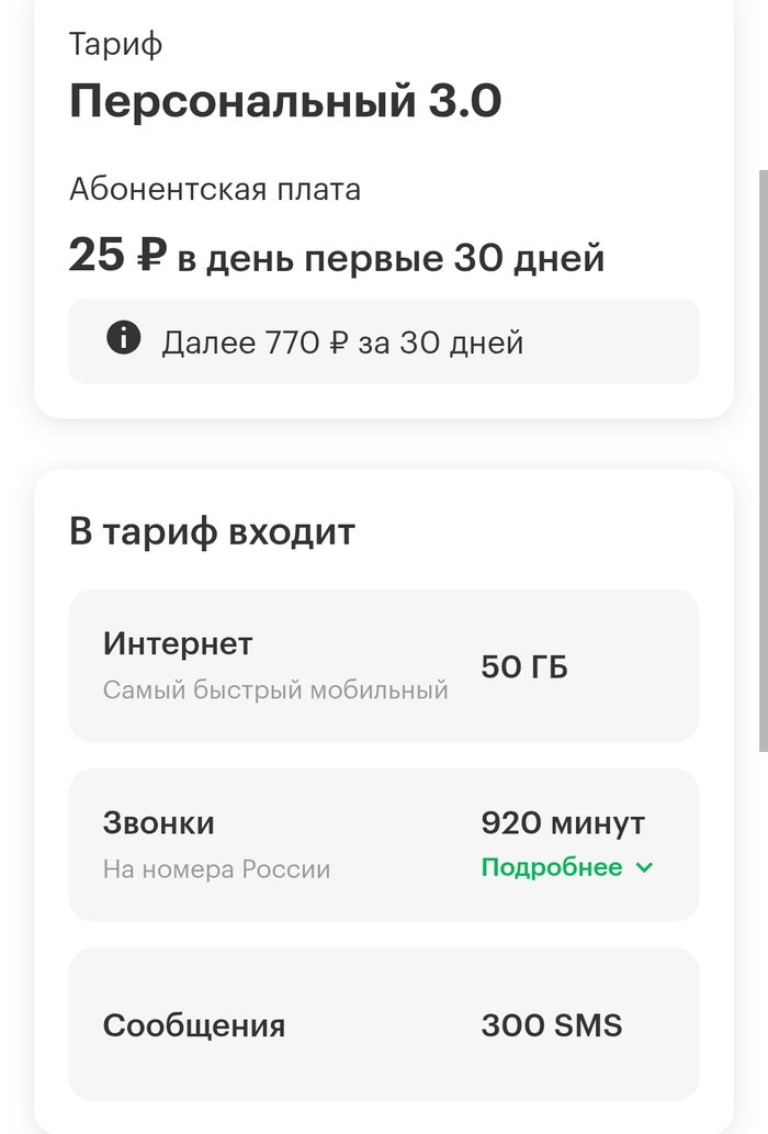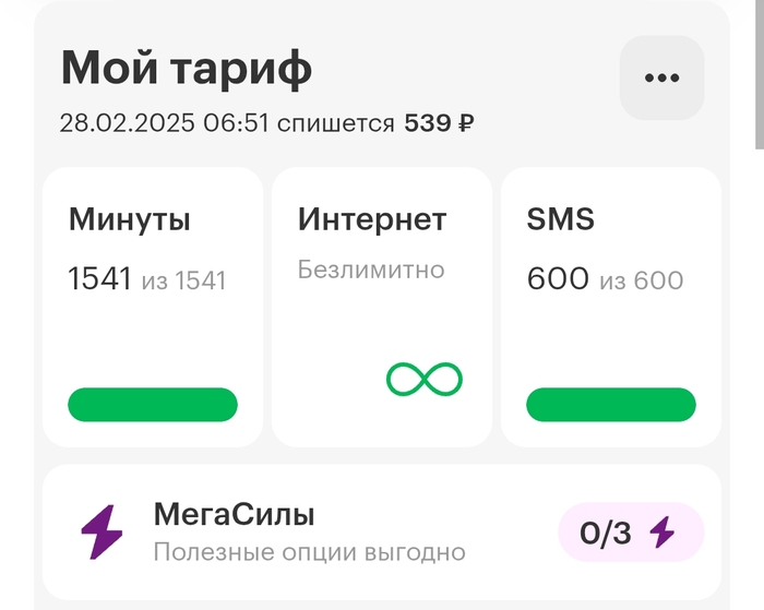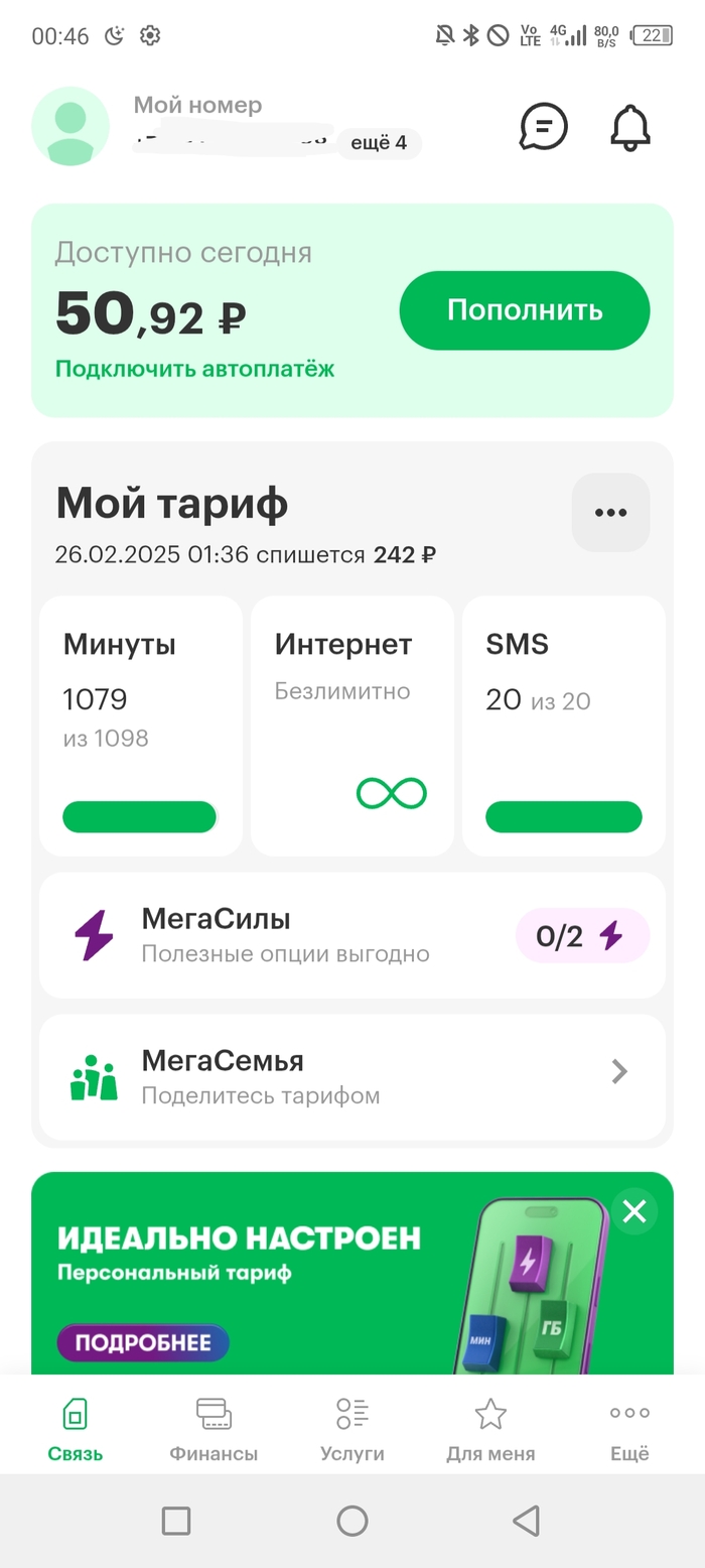 В тот же день мне позвонили из мегафоффа и предложили такие условия, что от них не то, чтобы отказаться - в них даже поверить невозможно. На скрине этот же тариф спустя ~4 года, за которые он подорожал на 90(!) рублей.