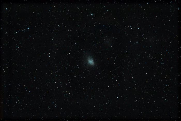 Следующим объектом, на который я навел свою трубу стала крабовидная туманность (М1). Она гораздо тусклее и меньше, потому на фото выглядит куда менее впечатляющее. По возможности буду еще дорабатывать фотографию в течение пары ночей, если повезет поймать ясную погоду до того, как туманность скроется за домами.