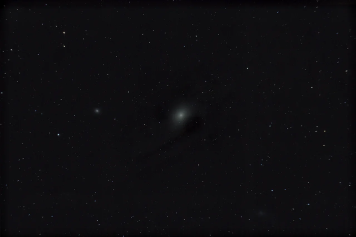 Между делом, когда нужно было скоротать немного времени до того, как туманностизаймут наиболее выгодное положение на небе, попробовал отснять галактику Андромеды. Она практически скрылась за ближайшим домом и до осени вряд ли удастся с ней еще поработать, но как только смогу обязательно продолжу съемку. Тут совсем небольшая выдержка и мало снимков, поэтому изображение пока тусклое, но уже просматривается темное газо-пылевое облако и некоторые его детали.