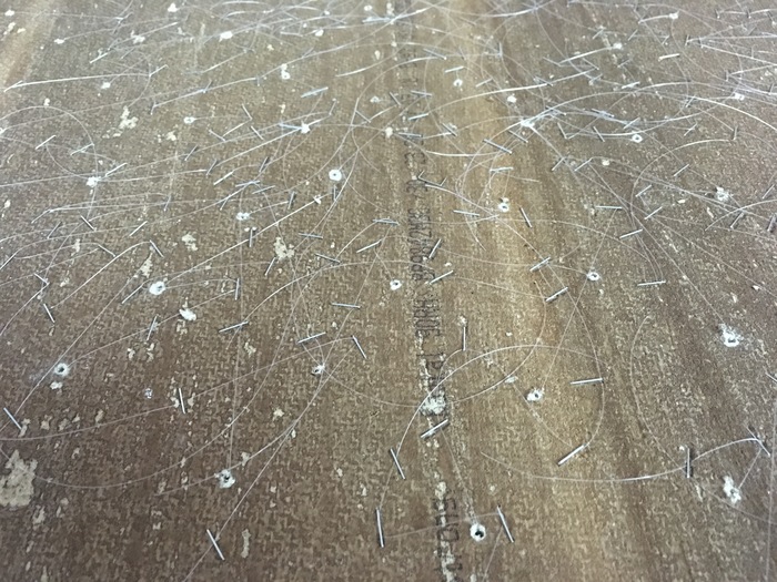 Тем временем берём приобретённую затеняющую сетку (55%) (6х8 метров) расстилаем во дворе, и с 6 метровой стороны (с обоих) на хомуты крепим 8мм арматуру.