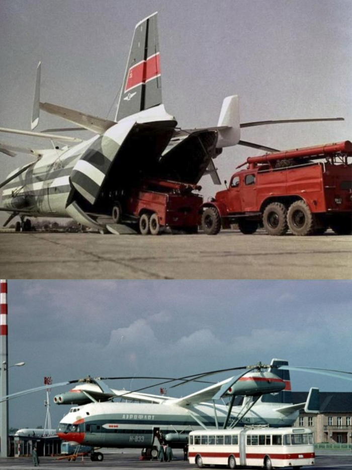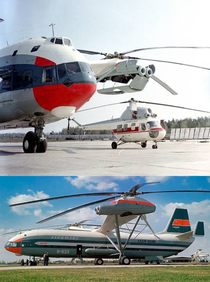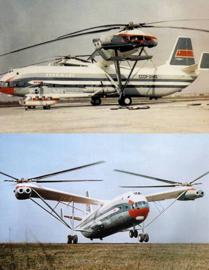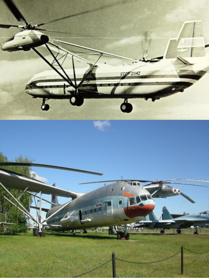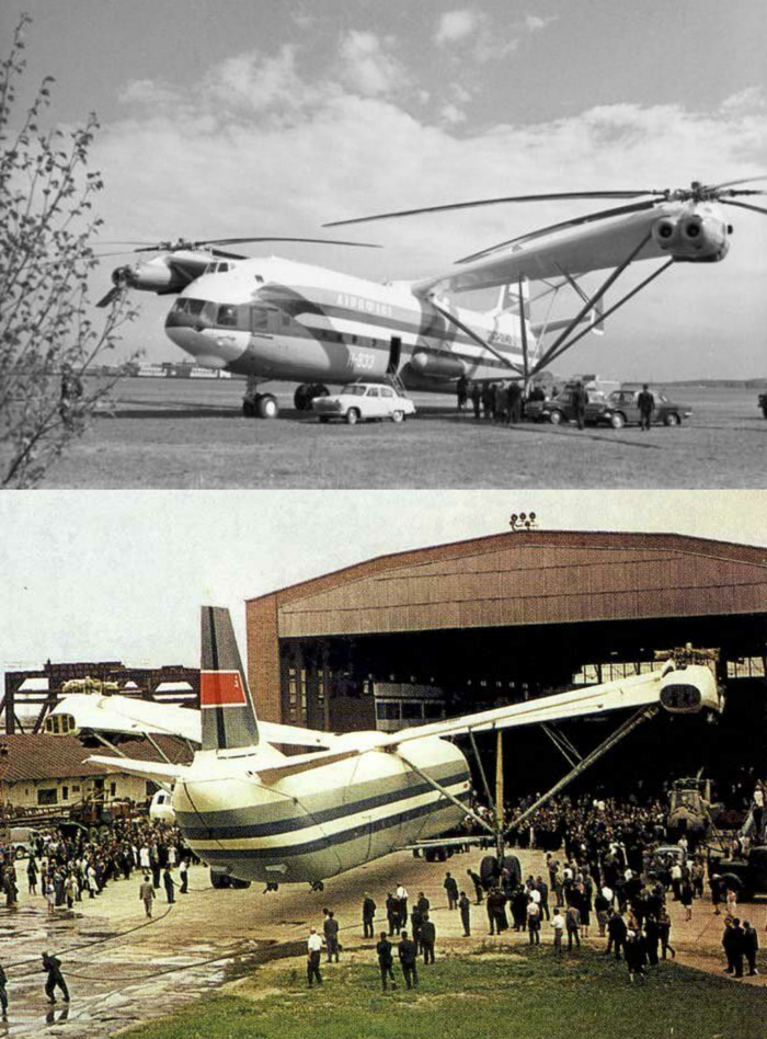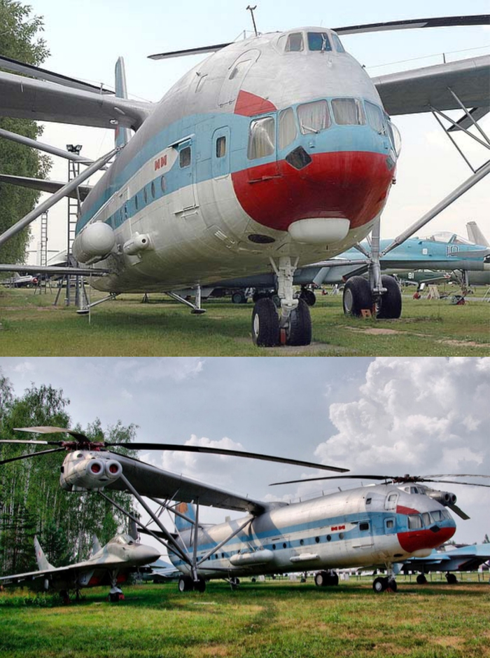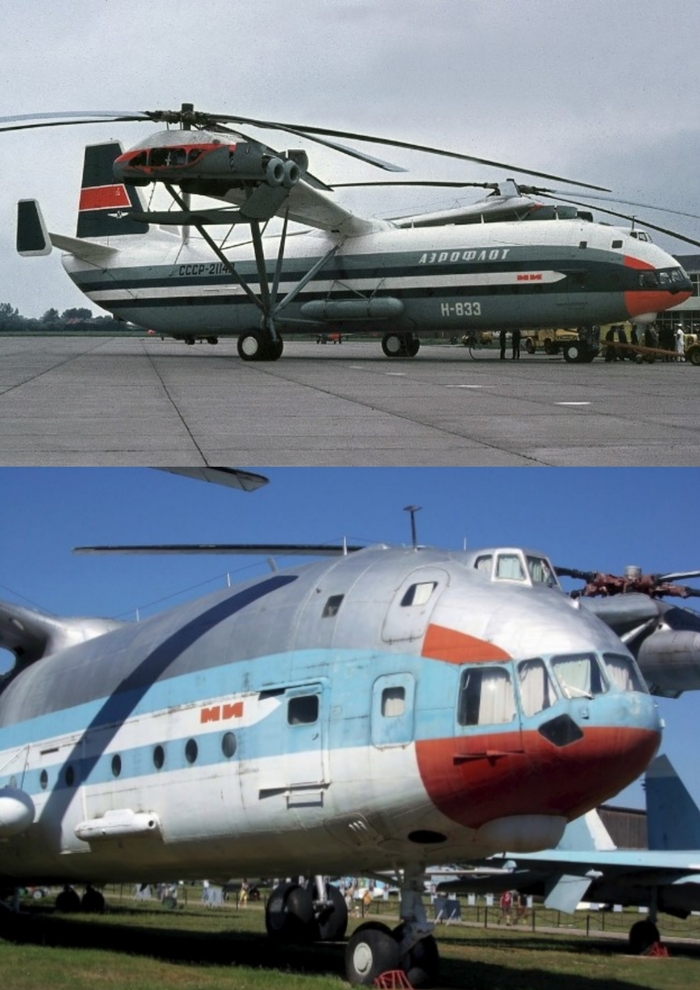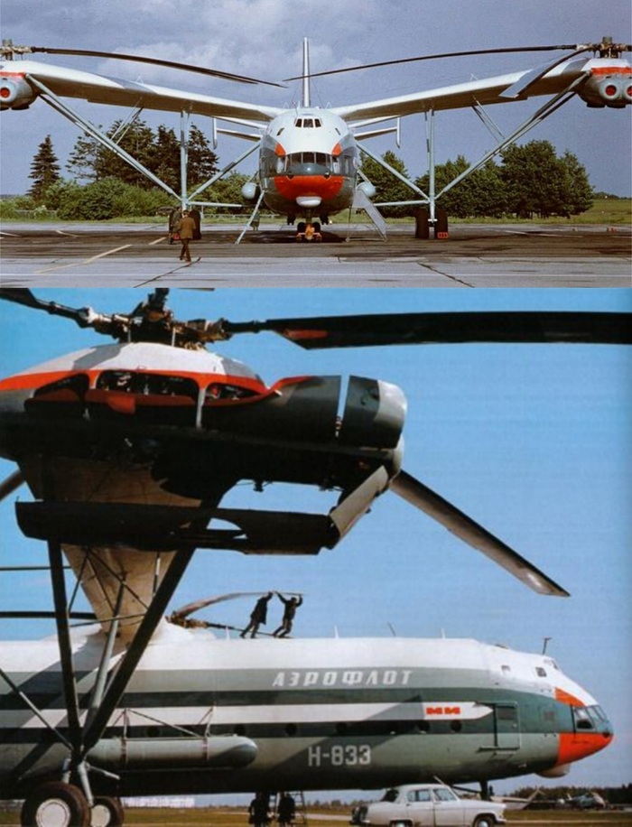 Ми-12М — развитие В-12 для транспортировки грузов массой 40т на 200км с двумя ГТД Д-303 мощностью по 20000л.с. и шестилопастными несущими винтами;