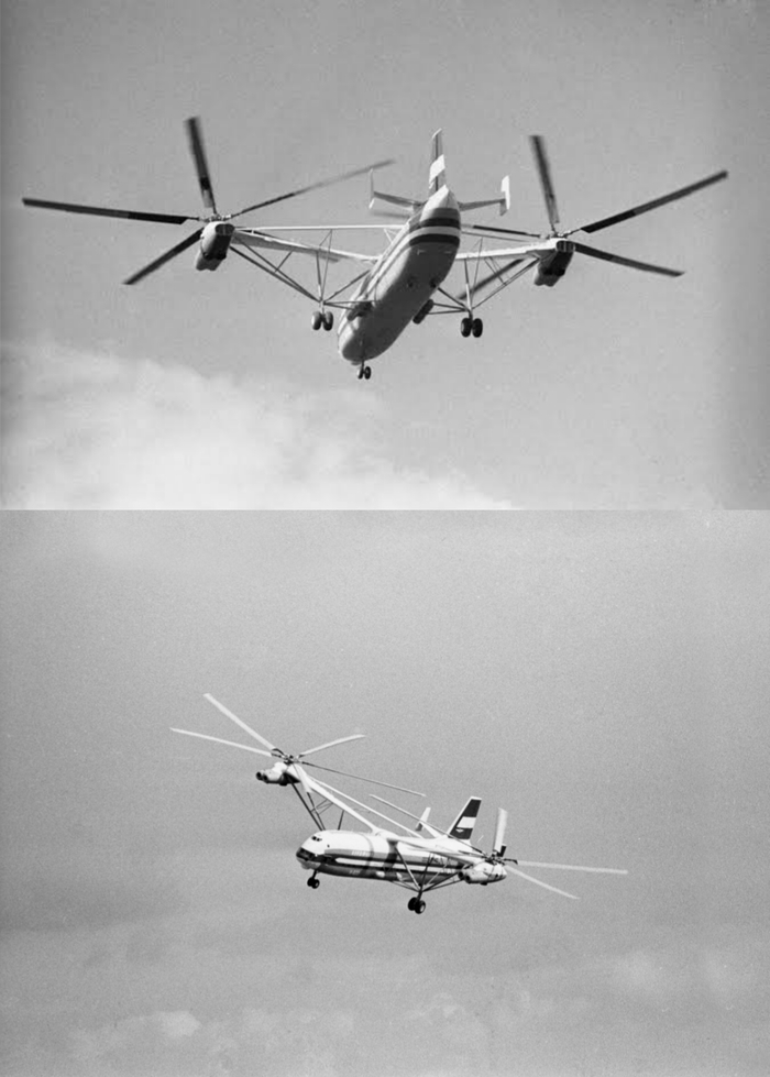 После выбора схемы предстояло решить, каким образом строить "мосты", соединяющие несущие винты: поперечно или продольно. Сначала решили проанализировать достоинства и недостатки продольной схемы, использованной на советских вертолетах Як-24 и американском V-44, который М. Л. Миль приобрел по поручению правительства во время командировки в США в 1960 году. Три Як-24 взяли у военных, пригнали из Торжка на испытательный аэродром в Панки, начали на них летать и изучать летные характеристики. Выполняли эту работу летчики-испытатели В. П. Колошенко, Р. И. Капрелян и Г. Р. Карапетян. Во время испытаний были обнаружены неравномерная загрузка переднего и заднего редукторов, большие вибрации, неустойчивость вертолета в полете. Те же самые недостатки проявились и при испытаниях американского вертолета. После исчерпывающего анализа Миль окончательно остановился на поперечной схеме. Вертолет такой конструкции еще перед войной построил в Германии Генрих Фокке. Его FW-61 выпускался серийно. У нас вертолеты поперечной схемы проектировали И.П.Братухин и Н.И.Камов.