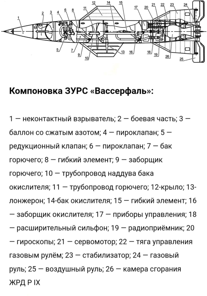 При разработке ракеты Wasserfall за основу взяли конструкцию баллистической A-4 (V-2). Корпус уменьшили вдвое и построили на основе несущих баков. При этом сохранились исходные обводы и пара наборов плоскостей на внешней поверхности. Кроме того, использовались те же компоновочные решения. По мере развития проекта, конструкция незначительно менялась.