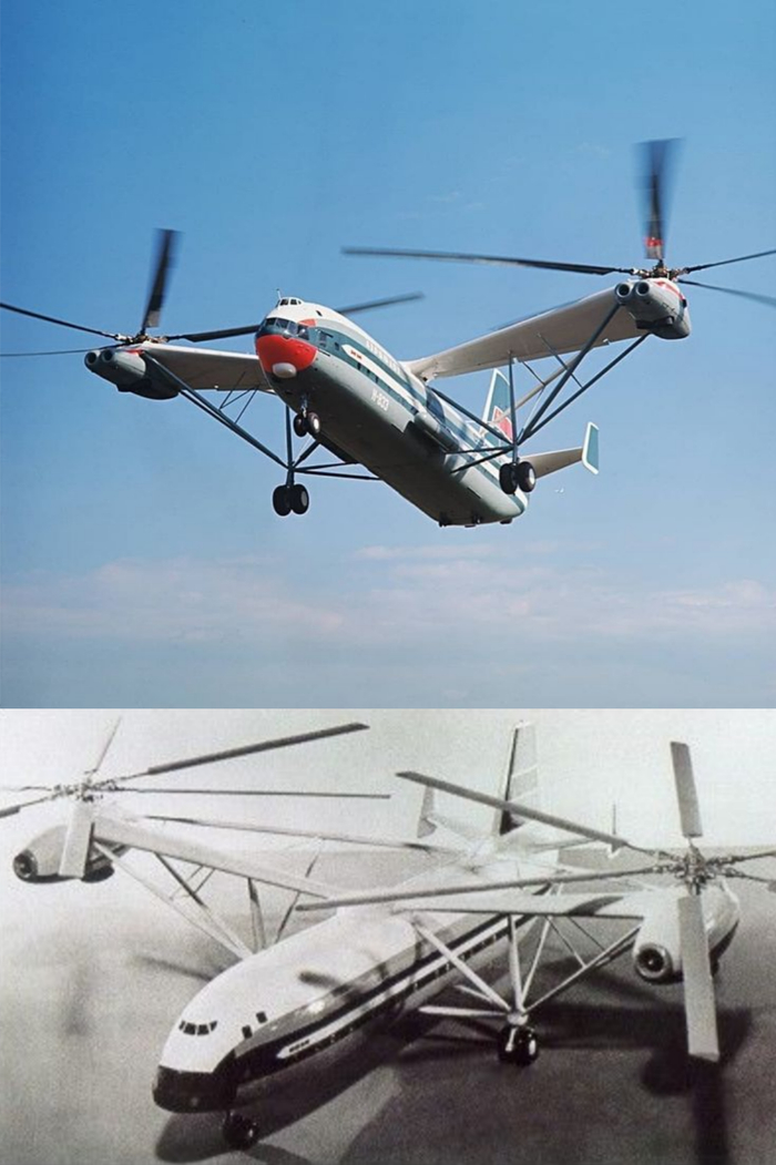 В-16 — с максимальной грузоподъемностью 50т с двумя мощными ГТД с тихоходными турбинами и шестилопастными несущими винтами.