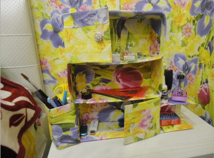 Пуфик и ножка стола - баночки из-под творожка для детского питания, обтянутые эластичной тканью. Клеила все на горячий клей-пистолет: пластик, кстати, очень хорошо клеит, лучше, чем другие клеи.