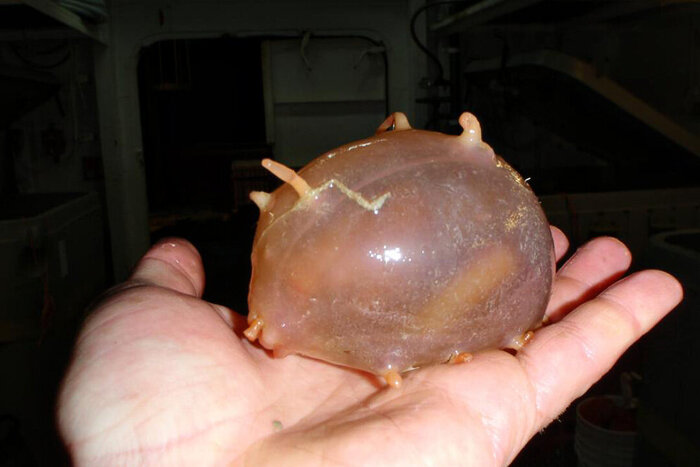 Научное название эти чудищ морских – скотопланесы. И, несмотря на их желеообразную внешность, они относятся к иглокожим, а точнее – к голотуриям