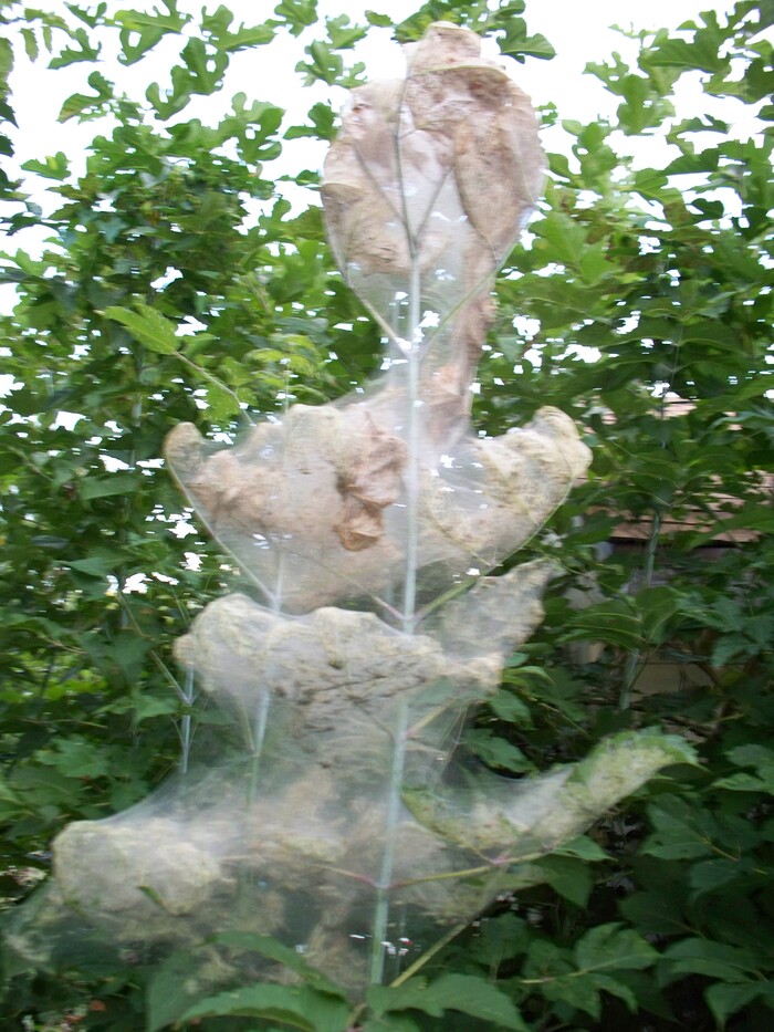 А вот ближайшая родственница этих медведиц - американская белая бабочка. Это грозный вредитель юга нашей страны. В отличие от предыдущих медведиц, гусеницы американской белой бабочки живут колониями, и буквально оплетают пораженные деревья паутиной.