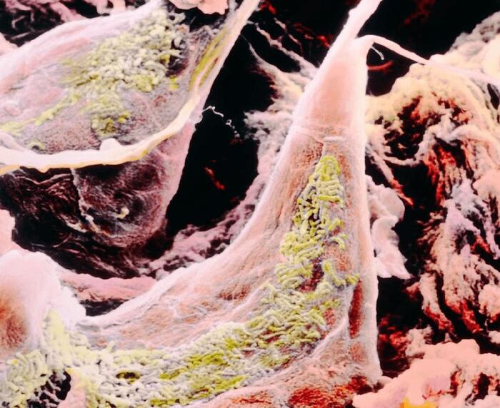 Поверхность человеческого языка с бактериями (жёлтый и серый цвет). Электронный микроскоп. Увеличение: x100