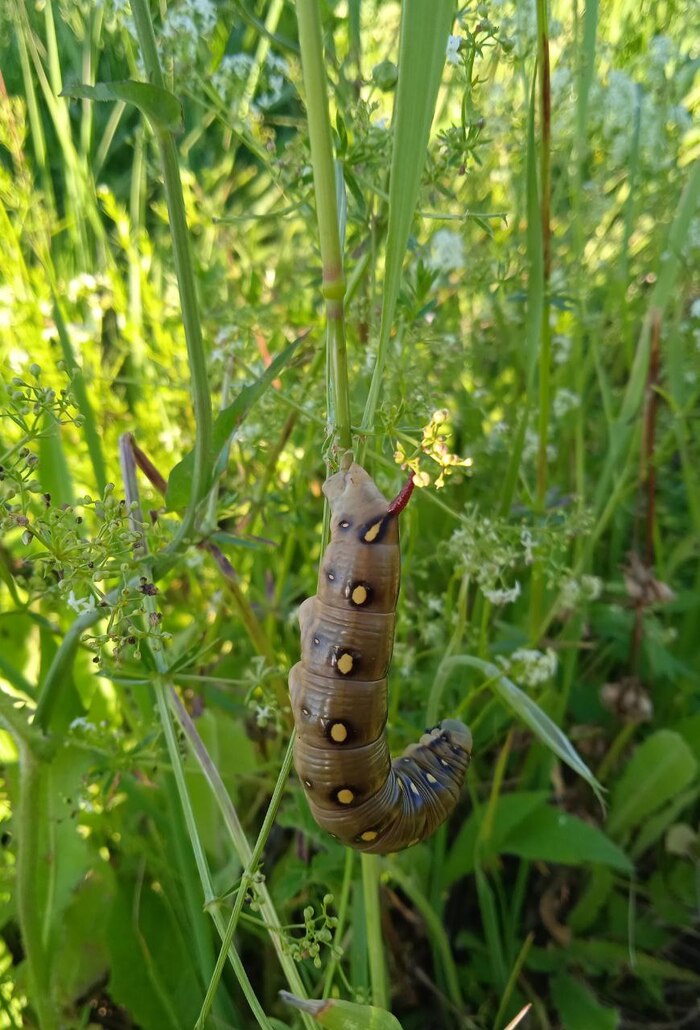 На лугу, где мы встретили нашу гусеницу, росло очень много подмаренника. Когда это растение цветет, оно выглядит бело-зелеными облачками среди трав. Бывает и разновидность с желтыми цветами.