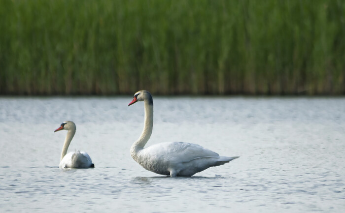 Утром 30 мая надо было отнести на дачу кое какие вещи с утра.Черешни нарвать,клубнику полить и тыды. Поэтому пошёл без фотоаппарата. И, как всегда в таком случае, встретил интересных гостей. Этими гостями оказались 4 лебедя-шипуна. Устроились почти ровно посередине отстойника. Благо, что он не сильно большой и я смог найти вечером место откуда их было нормально видно.