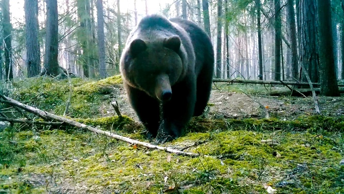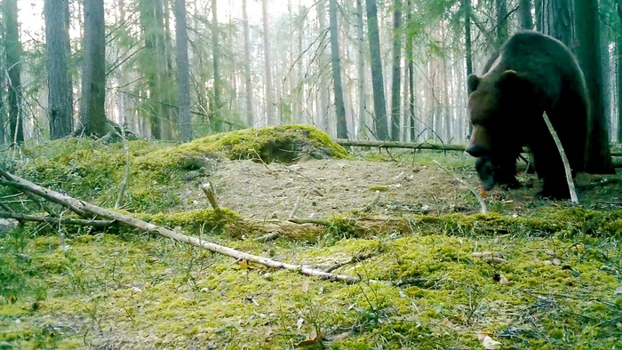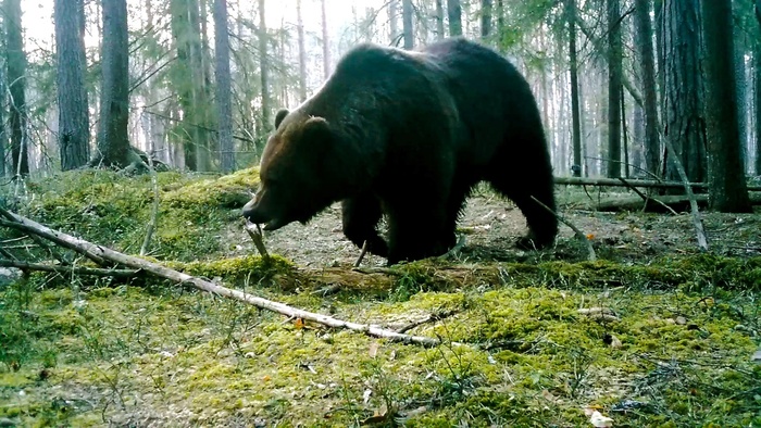 В мою видеоловушку во Всеволожском районе Ленинградской области попался бурый медведь. Это взрослый самец, на вид ему не меньше семи лет. Удивляет, насколько зверь уже упитанный. Успел восстановиться после продолжительного зимнего сна. Вылез из берлоги он примерно два месяца назад, и сейчас его основной корм – это растения. Главным образом, сныть. Растение это съедобно и для человека, в нем очень много белка – не зря его так любят и медведи! Сныть широко распространена в нашем регионе. Молодые листья активно используются в кулинарии, в том числе, и в сыром виде – в салате. Хотя медведь и является одним из самых крупных наземных хищников, на удивление, ¾ его рациона – это растения.