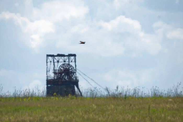 А вот так выглядит марево над степью. На фоне шахтного ствола парит болотный лунь.