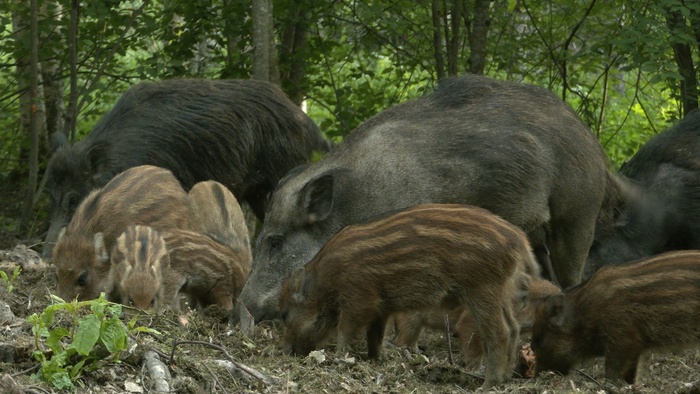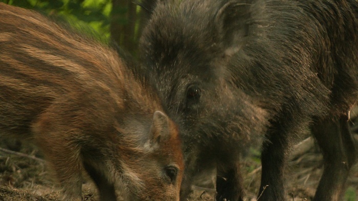 Чтобы не пропустить лесные новости Дикие поросята пока еще остаются полосатыми. Используя специальную палатку, мне удалось понаблюдать за жизнью кабанов. Это стадо состоит из трех взрослых свиней и их разновозрастных поросят. Велика вероятность того, что взрослые кабанихи, которых мы видим, это родные сестры. Дикие свиньи – самые плодовитые животные среди копытных, и способны размножаться уже на первом году жизни. В среднем, в помете 5-7 поросят. Здесь детеныши разного возраста: от одного до нескольких месяцев. Все они еще пока полосатые. Маскировочный окрас исчезнет постепенно, в возрасте 4-5 месяцев. Все поросята безукоризненно слушаются любую из свиней, ведь они одна семья. От дисциплины зависит их жизнь. В случае гибели одной из самок, заботу о поросятах возьмут на себя ее сестры.