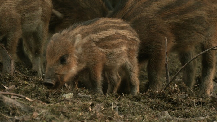 Кабаны - всеядные животные. Благодаря подвижной нижней губе, которая вытягивается в виде маленькой ложечки, они могут выбирать из земли даже совсем мелкую пищу - размером с зерно! Сейчас для кабанят главное - быть послушными и хорошо питаться.