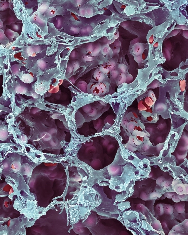 На фотографиях выше представлены срезы лёгочной ткани. Отлично видно стенки альвеол (бирюзовые, коричневые) и капилляры, внутри которых располагаются красные кровяные клетки (эритроциты, красный цвет), которые связывают кислород и доставляют его ко всем тканям и органам.