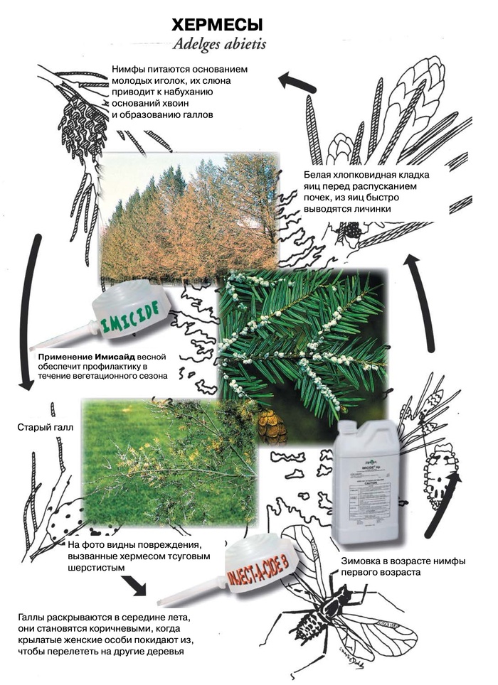 Ответ биолога: Это - Хермес. Тля, которая питается соком хвойных деревьев — елки либо лиственницы. Самки без крыльев, зато имеют удлиненные хоботы, окрас их желтый. Личинки буроватые либо зеленовато-желтые с белоснежной обильной опушкой. Насекомые быстрое перебираются на соседние деревья, поэтому необходима санитарная обработка.