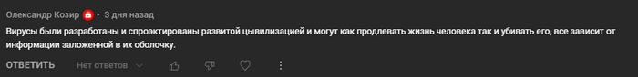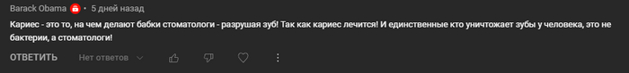 Это моя любимая категория комментариев. Я не знаю откуда у людей в голове возникают подобные теории, но то, что рак/вирусы/болезни/кариес придумали нацисты/евреи/мировое правительство/инопланетяне/стоматологи (нужное подчеркнуть) я вижу регулярно.