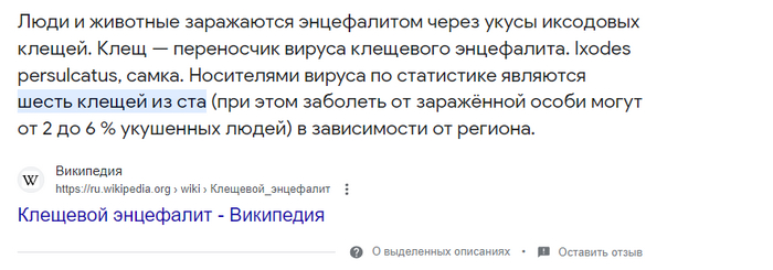 Тут на лицо систематическая ошибка выжившего, человек экстраполирует личный опыт на всех людей. По статистике лишь около 6% клещей заражены вирусом клещевого энцефалита, при этом не всегда даже от заражённого клеща вирус гарантированно передаётся человеку при укусе. Однако это не значит, что можно рисковать и не принимать никаких защитных мер.