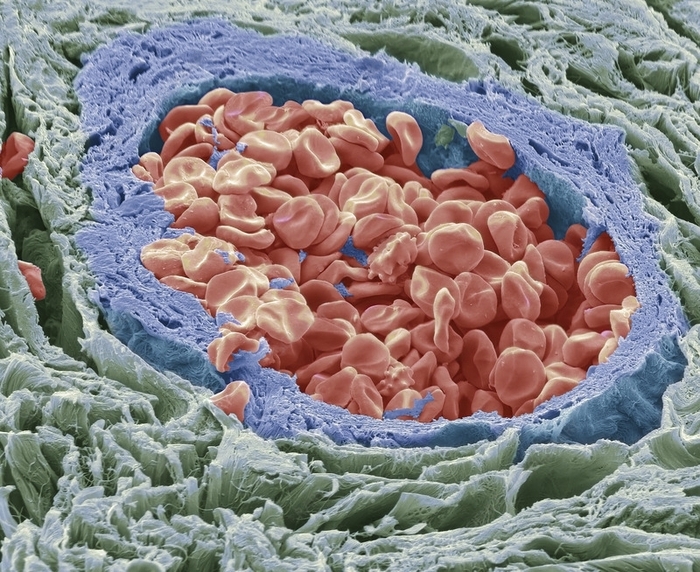 Внутри артерии находится множество кровяных клеток (эритроцитов, выделены красным), которые участвуют в газообмене и переносят кислород к тканям и органам. Увеличение: x1600 раз.