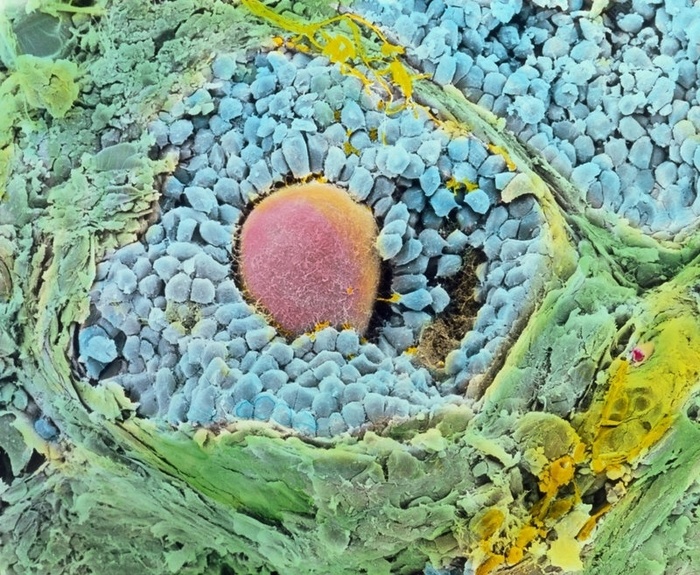 Созревание яйцеклетки (женской половой клетки) в яичниках. После созревания яйцеклетка (красный цвет) выходит из яичника в маточную трубу в результате разрыва зрелого фолликула и у женщины начинается овуляция. Увеличение: x1600 раз.