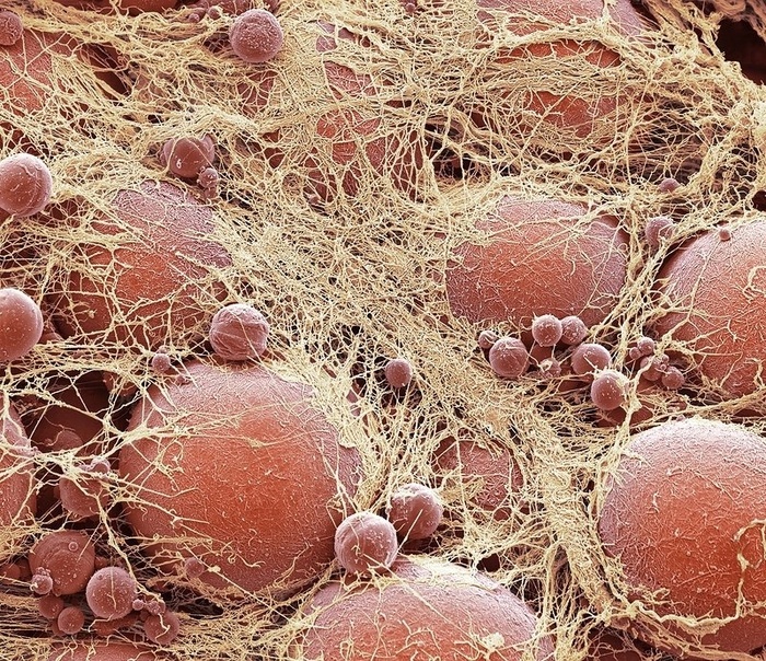 Жировая ткань состоит из клеток - адипоцитов (красный цвет). Они представляют собой резервуар, заполненный триглицеридами. Ткань оплетена обширной сетью кровеносных сосудов (бежевый цвет). Под действием гормонов, жировые клетки могут как накапливать жиры, так и выделять их в кровь, для того, чтобы организм преобразовывал их в энергию в случае дефицита питательных веществ. Увеличение: x2200 раз.