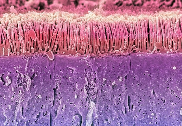 Клетки образующие кишечные ворсинки выстилают поверхность кишечника и таким образом увеличивают полезную площадь всасывания питательных веществ из пищи. Сами кишечные ворсинки связаны с кровеносными сосудами, по которым питательные вещества в дальнейшем транспортируются ко всем тканям и органам. Увеличение: x1200 раз.