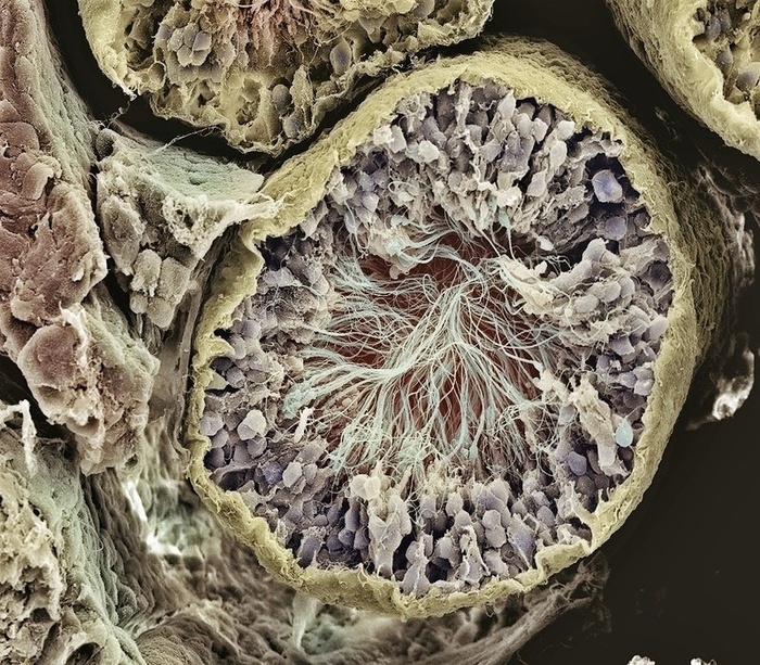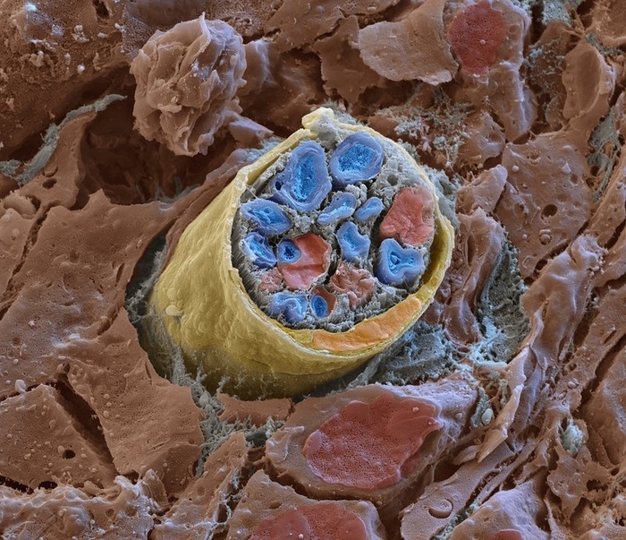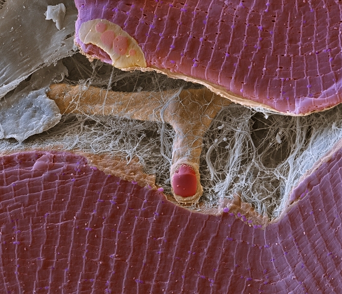 Каждое волокно окружено соединительной тканью эндомизия (серый цвет), которая содержит нервные клетки и капиллярные кровеносные сосуды (бежевый цвет) питающие мышечную ткань. Внутри капилляра в центре можно увидеть эритроцит (красный). Вверху слева — клеточное ядро (желтое). Увеличение: х5000 раз.