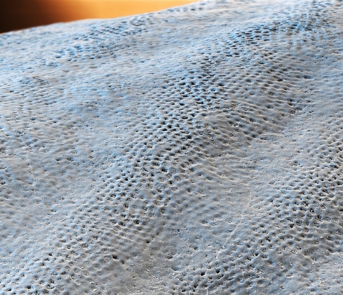На фотографии поверхность прорезавшегося зуба. Углубления, которые Вы видите, ранее содержали клетки амелобластов, которые выделяли минеральные вещества образующие эмаль. Увеличение: х600 раз.