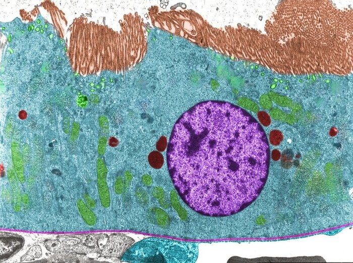 Цветная трансмиссионная электронная микрофотография (ПЭМ) клетки эпителия извитых канальцев почки, показывающая: щеточную кайму (коричневый), вакуоли (светло-зеленый), лизосомы (красный), митохондрии (зеленый), ядро (фиолетовый), базальную мембрану (розовый цвет). Снаружи клетки под базальной мембраной находится капилляр (голубой цвет).