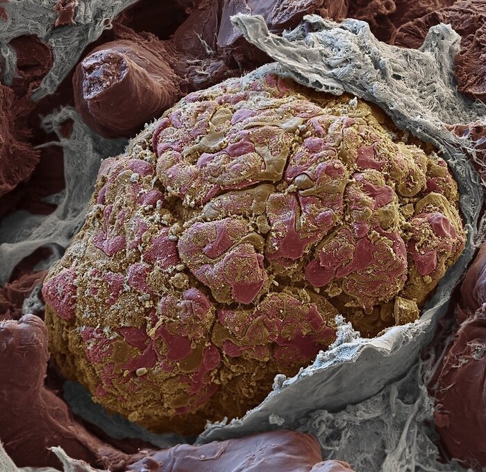 Почечный клубочек. Цветная сканирующая электронная микрофотография (СЭМ) среза здоровой ткани почки человека, показывающая клубочек (круглый, в центре). Клубочек представляет собой шарообразную сеть капилляров (крошечных кровеносных сосудов) в нефроне почки. Он помогает в формировании мочи путем фильтрации крови. Увеличение: х1000.