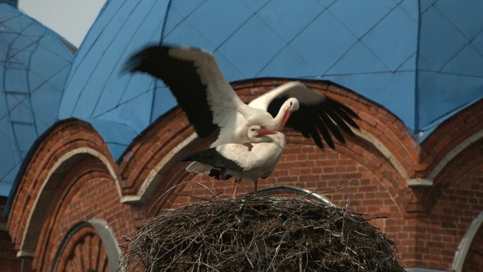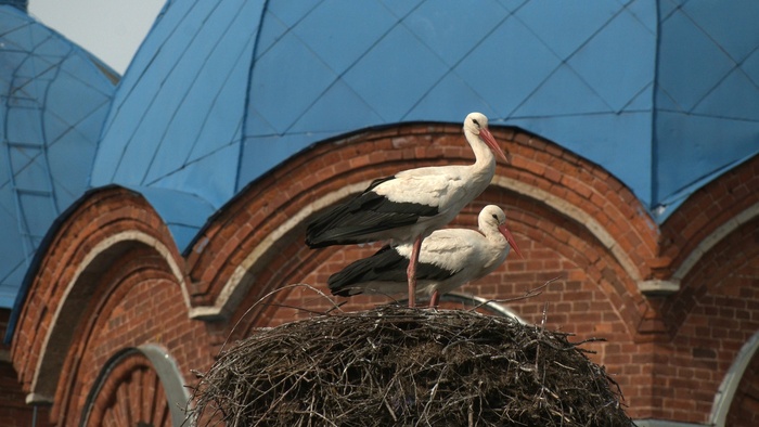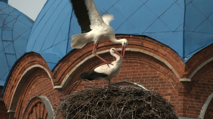Прямо на территории храма Рождества Пресвятой Богородицы в селе Рождествено Гатчинского района Ленинградской области белые аисты уже не первый год подряд успешно выводят птенцов!