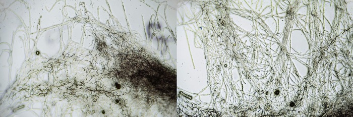 Бактерии и дрожжи внутри чайного гриба. Сканирующий электронный микроскоп. Обратите внимание, что хорошо видно сеть из тончайших нитей целлюлозных волокон, которые производят бактерии.