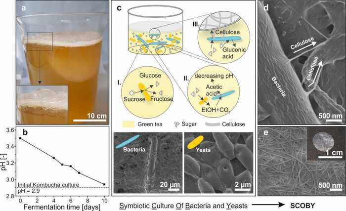 Кроме того, глюкоза перерабатывается в глюконовую кислоту. Соответствующие SEM - изображения (d) - бактерии производят целлюлозные волокна и (e) сплетённые целлюлозные волокна.