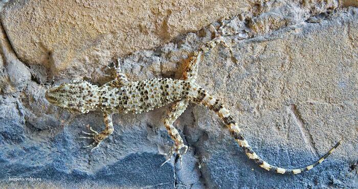 Каспийский геккон (Tenuidactylus caspius) - это относительно мелкие ящерицы, около 8 см длинной. Относится к роду тонкопалых гекконов (Tenuidactylus), в который входит 16 видов, 7 из которых встречаются на территории бывшего СССР и только один вид в России. Характерной особенностью которых являются длинные и искривленные пальцы. Такое ощущение, что они вообще не зависят от тела и живут своей жизнью, особенно задние. Этот геккон был описан с побережья Каспийского моря (из Казахстана), отсюда и его название.