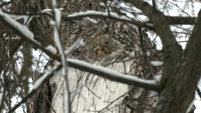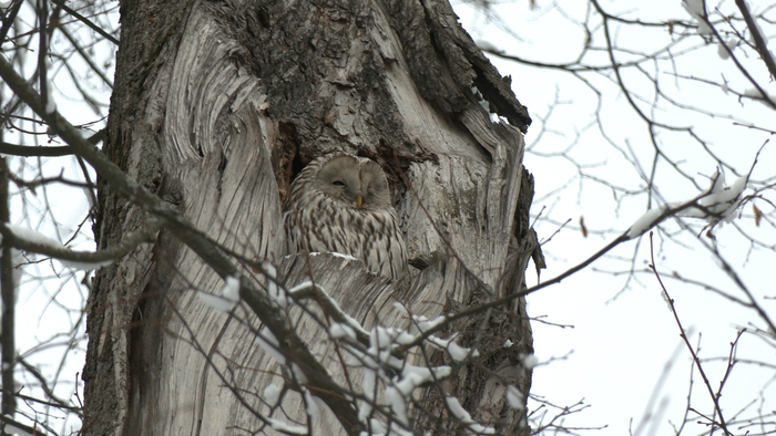 Другое ее название - длиннохвостая неясыть. Нетрудно догадаться, что сова обладает действительно длинным хвостом, который на фотографиях не виден: он скрыт в дупле. Впервые этот вид был описан на Урале, отсюда и одно из ее названий - "уральская". Именно длиннохвостые неясыти чаще всего встречаются в Северной столице. Обычно они залетают к нам зимой - в поисках пищи, а некоторые птицы круглый год живут в парках Петербурга, и даже продолжают у нас свой род.