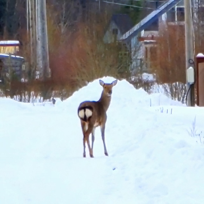 На днях в одном из поселков Гатчинского района по центральной улице невозмутимо прогулялась самка благородного оленя. В 60-е годы прошлого века этот вид оленей был специально завезен на Кургальский полуостров – в Кингисеппский район Ленинградской области. Сейчас там свободно обитает несколько десятков животных. Ярко белый зад позволяет отличить благородного оленя от любого другого вида парнокопытных! Остается загадкой: как эта грациозная красавица появилась столь далеко от основного места своего проживания?