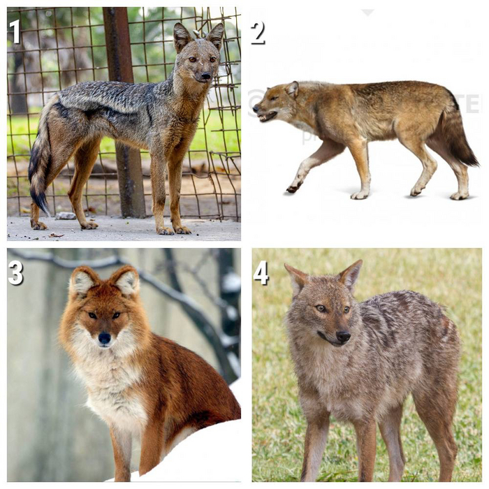 6 и 7. Два вопроса в одном. На коллаже вы видите четырёх представителей псовых, но только один из них принадлежит роду волков (лат. Canis). Вопрос первый: кто из представленных животных является волком, то есть принадлежит роду Canis. Вопрос второй: кто из представленных животных никогда не был волком, то есть не входил в род Canis.